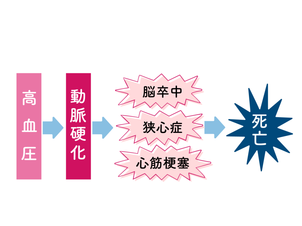 血圧の高い状態が慢性的になると、血管が圧力によるダメージを受け、血管の壁が厚くなったり、硬くなったりする動脈硬化の原因になり、狭心症や心筋梗塞、脳卒中、腎臓病などを招きやすくなります。